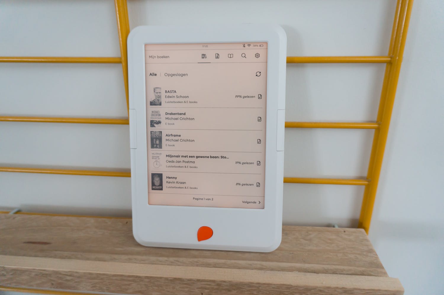 De e-books zelf zijn overzichtelijk ingedeeld. Onder in beeld zie je hoeveel pagina’s je nog hebt te gaan in het huidige hoofdstuk en hoe je ver je in het totale boek bent. Via de leesinstellingen kun je altijd de inhoudsopgave oproepen. Opvallend is wel dat als je een hoofdstuk hebt uitgelezen, het vervolgens twee seconden duurt voordat het volgende hoofdstuk verschijnt. Ik had daardoor regelmatig de neiging om nog een keer op de bladerknop te drukken, er zijn immers e-books waar af en toe een lege pagina in zit. Die actie wordt vervolgens wel verwerkt, waardoor je weer een pagina moet terugbladeren.