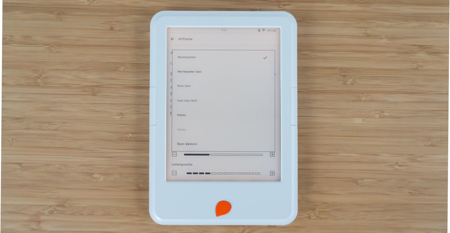 Een boek openen duurt in vergelijking met andere e-readers best lang. Met de knop op de voorkant open je tijdens het lezen de leesinstellingen. Die instellingen kun je net als op veel andere ereaders ook openen door in het midden van het scherm te tikken. Als je de knop langer ingedrukt houdt, dan schakel je de verlichting aan of uit. In de leesinstellingen biedt de Storytel Reader genoeg opties. Zo kun je kiezen uit zeven lettertypen, twaalf lettergroottes en drie niveaus van interlinie. De achtergrondverlichting kun je met twaalf stappen vrijwel traploos instellen waarbij je de lichtkleur naar keuze kunt instellen van koud naar warm in eveneens twaalf stappen.