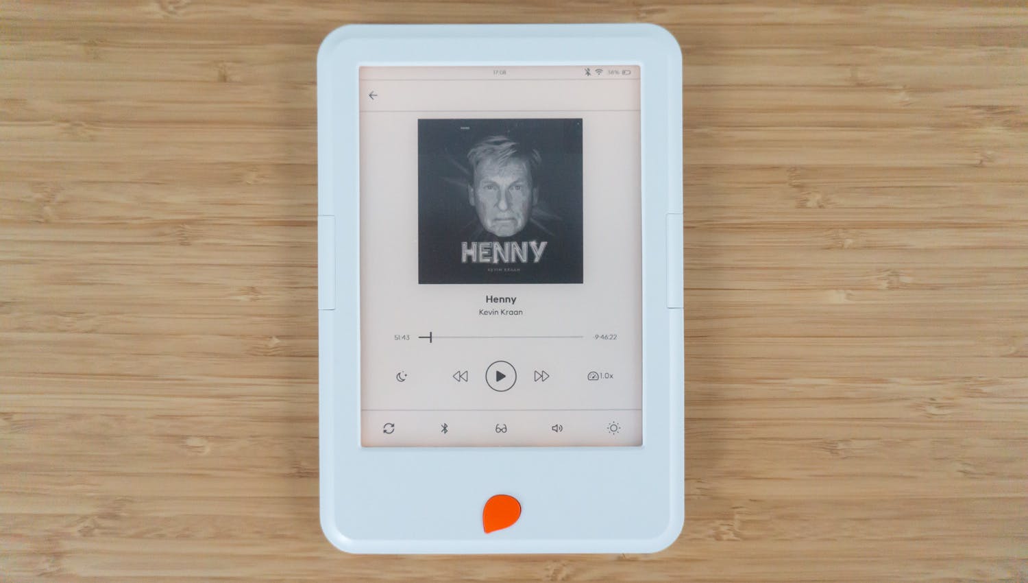 Behalve lezen, kun je met de Storytel Reader ook naar boeken luisteren. Je kunt een hoofdtelefoon via de 3,5mm-aansluiting aansluiten of een hoofdtelefoon of speaker via bluetooth. In beeld wordt vervolgens mediabediening getoond waarmee je het boek kunt afspelen. Naar keuze kun je de afspeelsnelheid verhogen of verlagen. Wanneer er van het boek ook een e-book-versie is, dan kun je overschakelen naar het e-book en verder lezen waar het audiobook gebleven was en vice versa. Dat werkt ondanks een kleine vertraging opvallend goed en als je in sommige situaties liever leest of luistert is dit echt een handige functie. De smartphone-app kan dit overigens ook. Gebruik je naast de Reader ook de app, dan wordt er tussen je apparaten gesynchroniseerd waar je gebleven was. Soms duurt dit heel even, maar over het algemeen werkt dit goed.