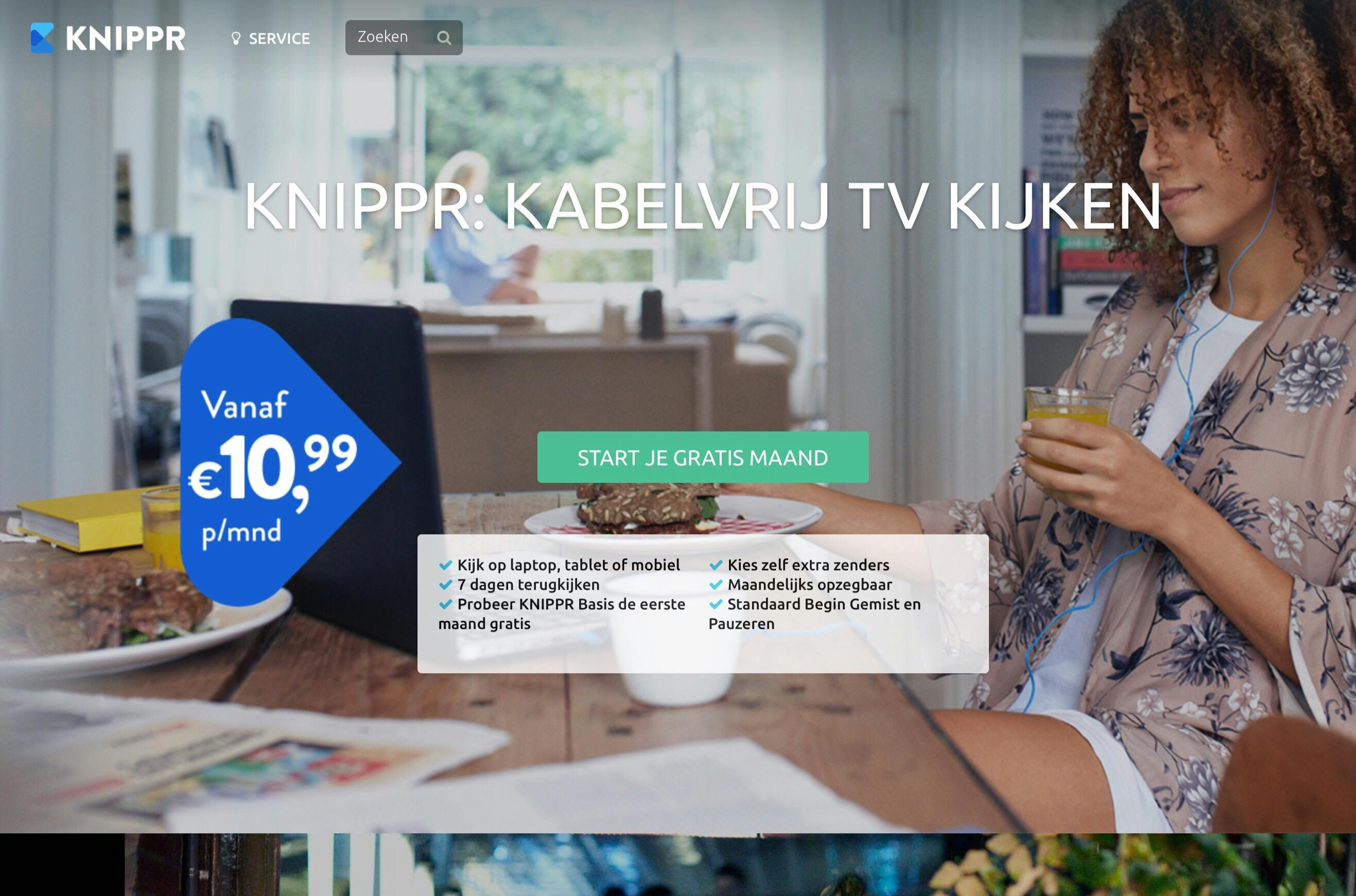 Knippr is een abonnementsdienst waarmee je naar de 12 populairste Nederlandse zenders kunt kijken. Daarbij zitten zenders van de NPO, RTL, en SBS. Daarnaast kunnen abonnees losse zenders uit bijvoorbeeld het buitenland er bij kopen, voor 99 cent per maand.