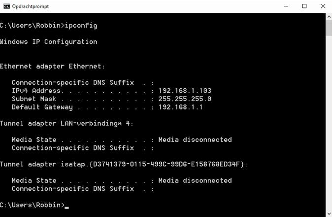 De opdracht ipconfig.exe toont het IP-adres van je computer en het IP-adres van je router.