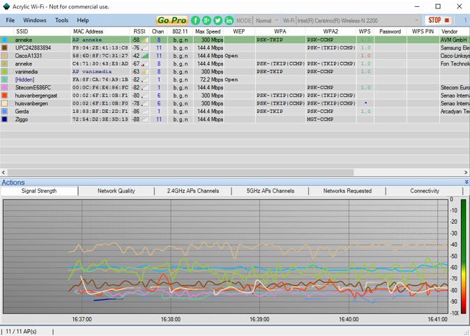 Bij dezelfde netwerknaam hoef je niets in te stellen op bijvoorbeeld je smartphone. In principe verbindt apparatuur met het sterkste accesspoint, maar in de praktijk wil een laptop of smartphone nog wel eens verbonden blijven met het zwakkere accesspoint. Je kunt beide manieren uiteraard uitproberen. Kies altijd een ander kanaal dan je hoofdnetwerk, en kies hierbij een kanaal dat zo vrij mogelijk is. Wel kun je je op de 2,4GHz-band het best beperken tot de kanalen 1, 6 of 11. Een hulpprogramma als Acrylic WiFi Free ziet wat er allemaal in de lucht hangt en welke kanalen het minst druk zijn. Vergeet niet om je wifi-netwerk te beveiligen! WPA2 is de beste keuze, als dat niet beschikbaar is kies je voor WPA. Het wachtwoord van het draadloze netwerk mag hetzelfde zijn als dat van je hoofdnetwerk. Gebruik je dezelfde SSID, dan moet het hetzelfde zijn.