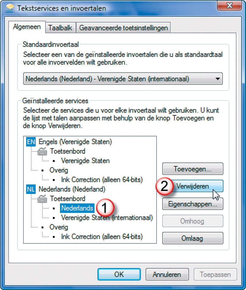 Klik in het venster Landinstellingen op het tabblad Toetsenborden en talen, klik daar op de knop Toetsenborden wijzigen. In het venster Tekstservices en invoertalen vindt u onder het kopje Geïnstalleerde services een lijstje met aanwezige toetsenborden en talen. Onder het kopje Nederlands selecteert u dan onder Toetsenbord de optie Nederlands (1), klik vervolgens op de knop Verwijderen (2). Klik tot slot op Toepassen en u schakelt nooit meer per ongeluk tussen verschillende toetsenborden. Het kleine toetsenbordpictogram rechts onderin beeld, direct naast de systeemwerkbalk is nu verdwenen.