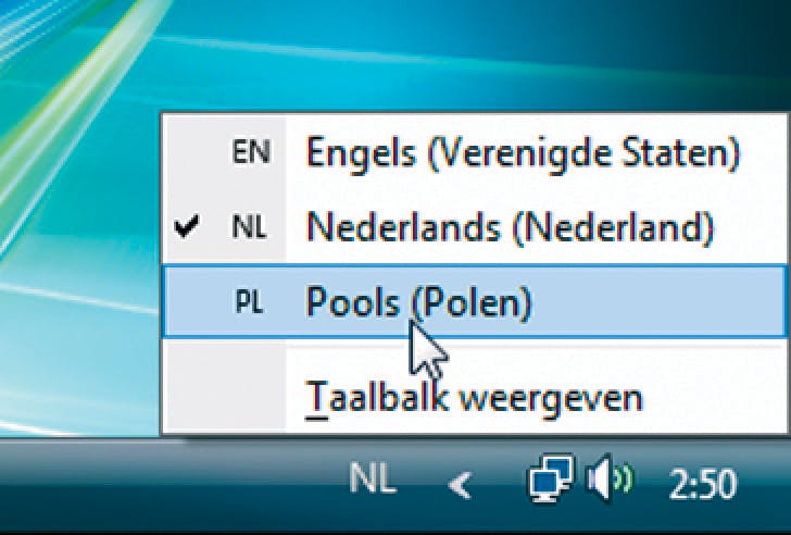 De reden dat we als voorbeeld het Poolse toetsenbord namen, is omdat hier iets bijzonders mee aan de hand is: in plaats van de standaard Poolse indeling is de programmeursindeling veel meer ingeburgerd en blijkt deze in de praktijk ook stukken beter te werken. Iets dergelijks geldt (wellicht) ook voor sommige andere talen die de wereld rijk is, vraag dat altijd even na aan iemand die een taal van huis uit spreekt. U kunt desgewenst nog meer toetsenbordtalen toevoegen. Bent u klaar, dan klikt u op OK in alle openstaande vensters. De toetsenbordtalen zijn nu klaar voor gebruik. Een andere toetsenbordtaal kiezen doet u door rechts onderin beeld (links van de systeemwerkbalk) op het taalpictogram te klikken, standaard vinden we hier NL voor Nederlands. Kies een van de nieuw geïnstalleerde talen, waarna het pictogram mee verandert.
