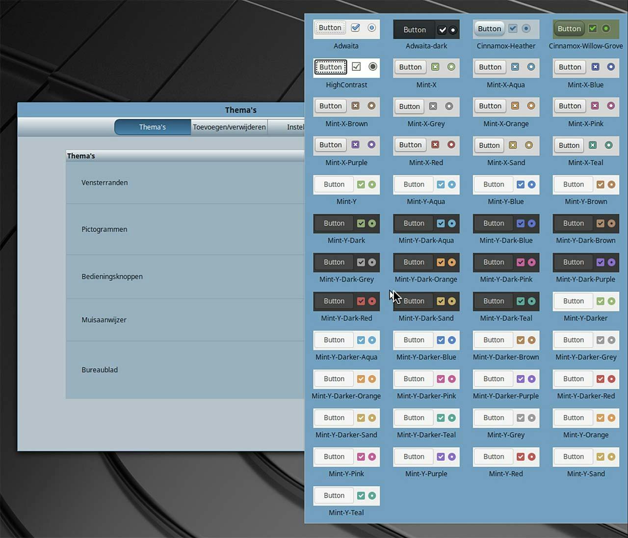 Linux Mint is eigenlijk dé versie waar je als Windowsgebruiker naar over wilt stappen. De gebruikersinterface lijkt namelijk erg op die van Windows. Inclusief een menubalk, startknop en startmenu. Je vindt er dus razendsnel je weg in. De overstapvraag begint steeds actueler te worden, want wat ga je begin volgend jaar met Windows 7 - waar de ondersteuning dan van stopt - doen? Iets om alvast eens over na te denken. En wellicht al wat - desnoods in een virtuele machine - te experimenteren met Linux Mint. Deze zeer gebruiksvriendelijke Linux-variant beschikt over allerlei zaken die je ook van Windows kent. Zoals bijvoorbeeld het gebruik van thema's. Bevalt het standaardthema je niet, dan kun je kiezen uit een berg aan alternatieven! Klik daarvoor op de startknop rechtsonder in beeld en daarna in het uitgeklapte startmenu onder Voorkeuren op Thema's. In het daarop geopende venster kun je het standaardthema (of een straks geïnstalleerd ander thema) aanpassen aan je wensen. Klik op een item in de lijst die te zien is na een klik op de knop/tab Thema's (standaardselectie na openen van het gelijknamige venster) en je ziet dat er diverse keuzen beschikbaar zijn. Zo pas je welk thema dan ook helemaal aan je eigen smaak aan.