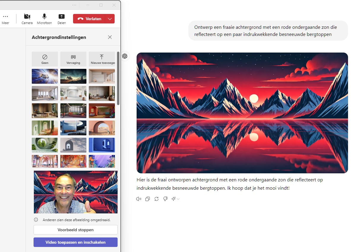 In het gratis Microsoft Teams start je bijvoorbeeld een videogesprek via Nu vergaderen / Vergadering starten. Als je op Meer en Achtergrondeffecten klikt, kun je uit tientallen achtergronden kiezen of je achtergrond vervagen. Via Nieuwe toevoegen importeer je een specifieke achtergrond, bijvoorbeeld ontworpen door een AI-beeldgenerator.