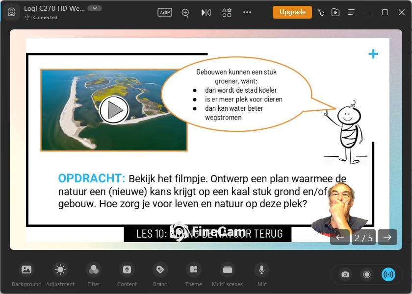 Kies je via Theme een lay-out waarbij je eigen webcambeeld niet het volledige scherm bedekt, dan kun je met Content tegelijkertijd andere inhoud tonen. Denk aan een webpagina, applicatievenster, video (ook via een YouTube-url), iPhone-beeld, PowerPoint-presentatie, tekst of eigen foto. In je videoconferentietool selecteer je FineShare FineCam om de virtuele camera te gebruiken. Mogelijk moet je nog bevestigen met de blauwe knop Virtual Camera rechtsonder in FineCam.