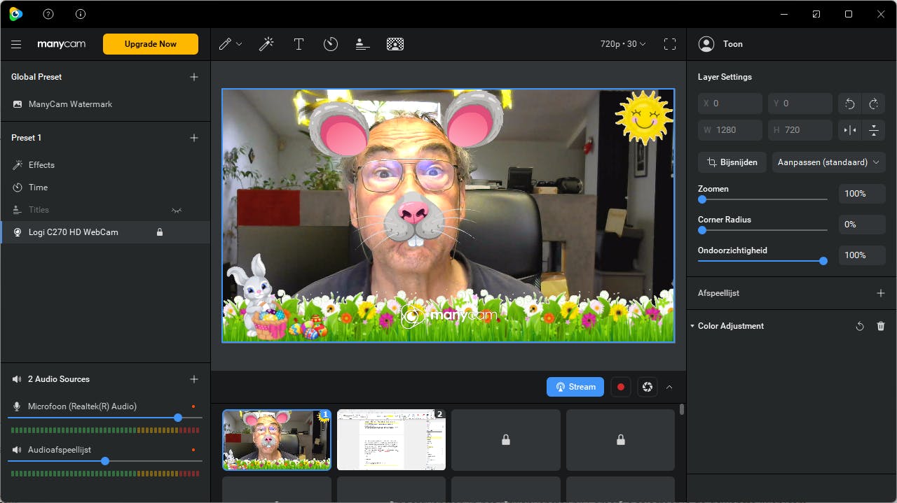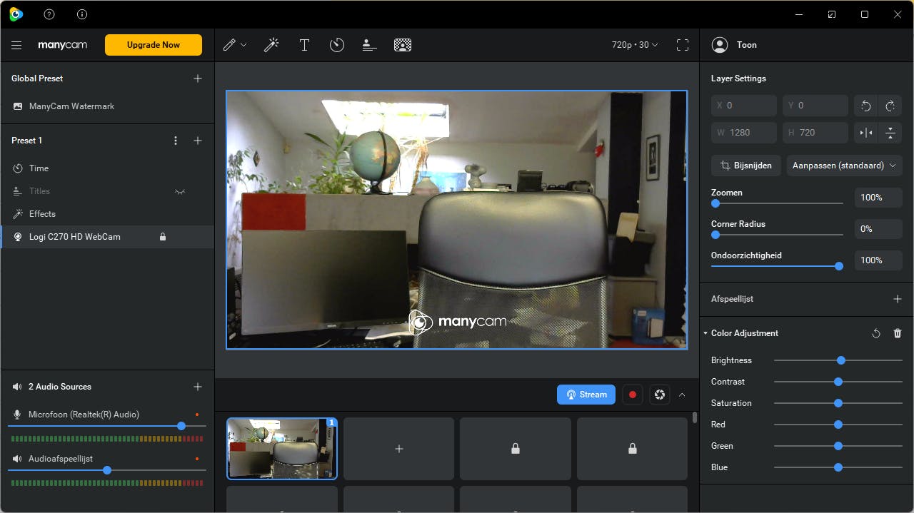 FineCam bevat ook de knop Multi-scenes waarmee je meerdere virtuele opzetten klaarzet en snel schakelt. Helaas is deze functie alleen beschikbaar in de Pro-versie. Een goed alternatief is dan ManyCam voor Windows en macOS. De betaalde versies zijn er vanaf ongeveer 45 euro per jaar. Je hebt dan geen watermerk en meer effecten, hogere resoluties (full HD tot 4K) en meerdere simultane videobronnen.