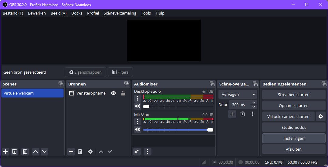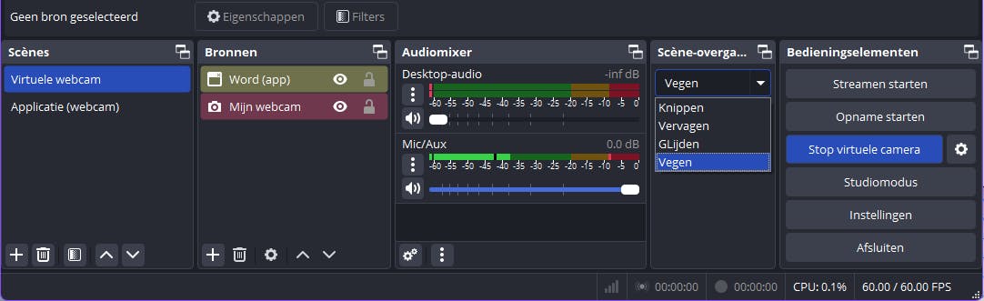 Onder het camerabeeld bij Scène-overgangen kun je bovendien een transitie-effect instellen dat bij een scène-wissel ook binnen je videoconferentie-app te zien zal zijn. Je kunt op elk moment op Stop virtuele camera drukken om de videostream vanuit OBS Studio te onderbreken.