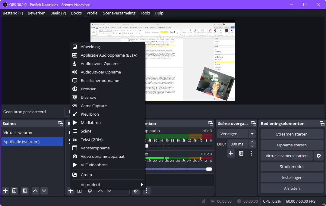 Voor extra content klik je op het plusknopje bij Bronnen en voeg je onderdelen toe zoals Afbeelding, Beeldschermopname, Browser, Diashow, Vensteropname (van een nader te bepalen app) of Mediabron (om bijvoorbeeld een eigen videobestand te tonen). Elk van de toegevoegde bronnen kun je vervolgens positioneren en schalen op je canvas.