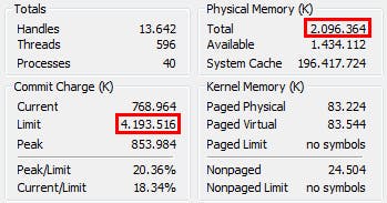 Totaal beschikbaar virtueel geheugen (Limit) en RAM (Physical). Het verschil (hier 2 GB) is toegewezen aan de pagefile.