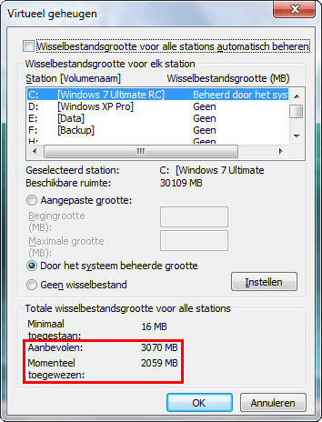 Hebt u meer dan 1 GB RAM, dan zal Windows ongeveer dezelfde hoeveelheid schijfruimte aan de pagefile toewijzen. De aanbevolen omvang is daarbij steeds anderhalf maal de hoeveelheid RAM.