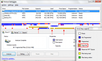 Zoals gezegd kan er fragmentatie optreden wanneer Windows de aan de pagefile toegewezen schijfruimte vergroot. Gelukkig is dit meestal maar tijdelijk. Soms raakt de pagefile echter permanent gefragmenteerd. Dit kan bijvoorbeeld al gebeuren tijdens de installatie van Windows, maar het doet zich soms ook voor na een ‘repair install’ of na het wijzigen van de schijfindeling met een partitieprogramma. In Windows XP ziet u in het analyserapport van Schijfdefragmentatie of de pagefile gefragmenteerd is.