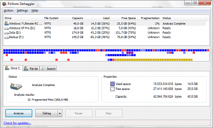 In Vista en Windows 7 gebruikt u hiervoor Defraggler. Gebruik dit programma alleen om de schijf te analyseren, niet om deze te defragmenteren! Defraggler gebruikt namelijk een ander defragmentatie-algoritme dan Windows, dat in conflict komt met het prefetching-proces dat sinds XP wordt gebruikt. Nadat u op de knop Analyse hebt geklikt, ziet u een grafische weergave van de schijf. Een uitleg van de betekenis van de verschillende kleuren krijgt u via Help / Drive Map Legend.