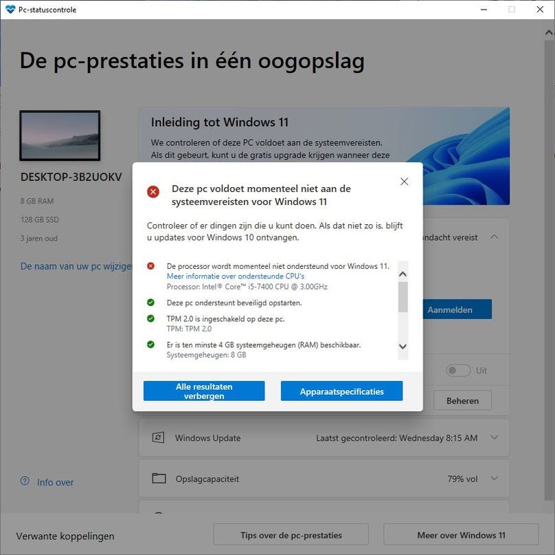 Overigens is de kans best groot dat de app aangeeft dat jouw pc niet voor Windows 11 ontvankelijk is. Je hoeft dan zeker nog niet gelijk naar de winkel te rennen voor een nieuwe computer, want Windows 10 wordt nog tot eind 2025 ondersteund.