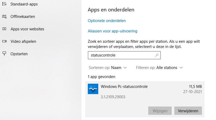 Zodra je de update hebt doorgevoerd, vind je de statuscontrole-app in je startmenu terug. Zit je er nu echt niet op te wachten, dan verwijder je het net zo eenvoudig weer onder Instellingen, Apps, Apps en Onderdelen. Zoek Windows Pc-statuscontrole op en kies Verwijderen.