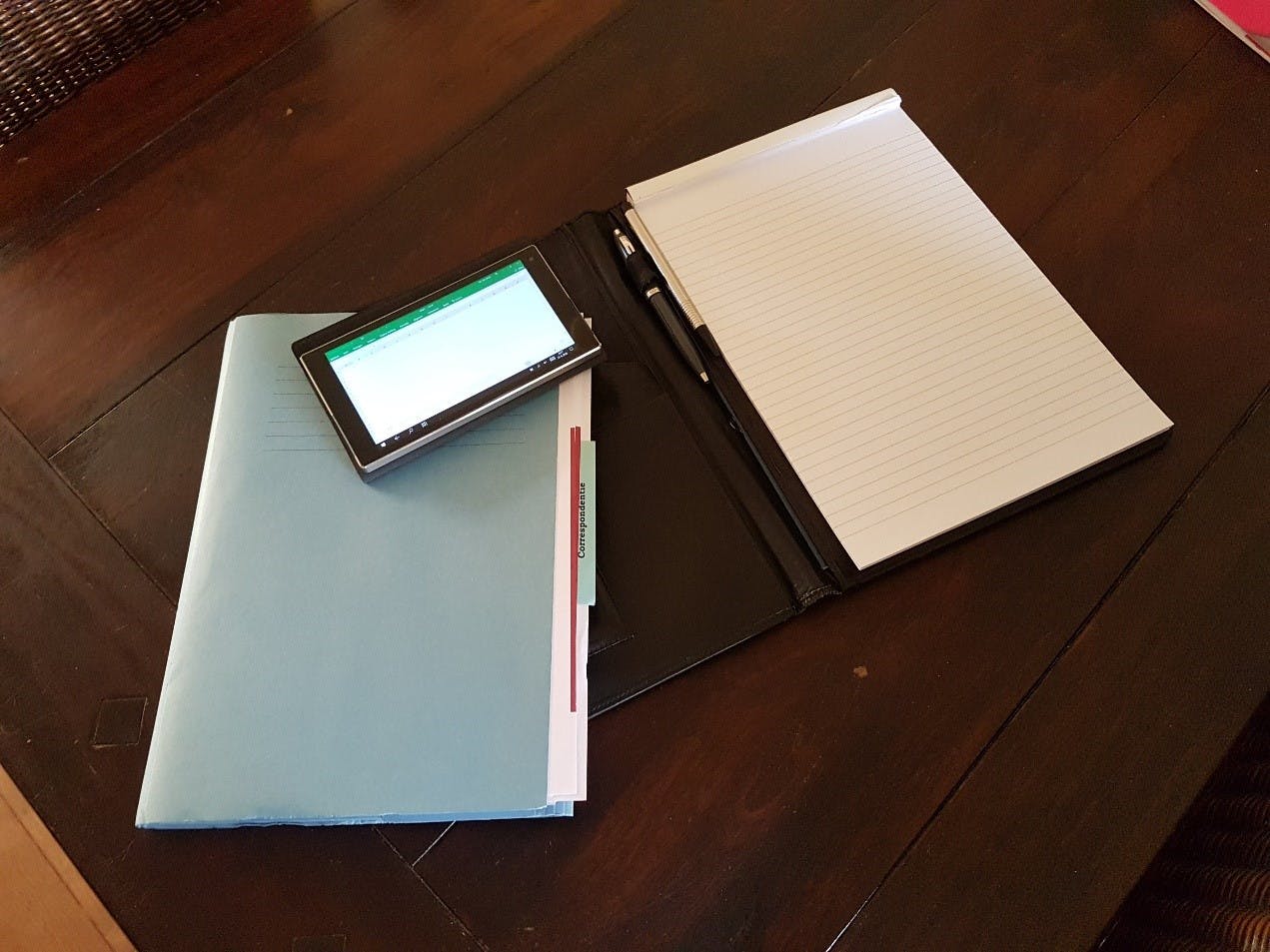 Ondanks het bedieningsprobleem op het kleine scherm, is wel duidelijk dat het erg prettig is als ik altijd mijn DSM, dit is het programma die ik gebruik voor mijn werk, kan raadplegen via de Sirius A. Bij overleg met klanten ben ik nu in staat relevante informatie even op te zoeken, zodat een overleg niet opgehouden wordt door onduidelijkheden die niet ter plaatse bekeken kunnen worden. Via de wifi (hotspot via mijn telefoon) werkt de Sirius A soepel. In mijn schrijfmap geschoven vormt hij daar al bijna een vast onderdeel bij een bespreking.