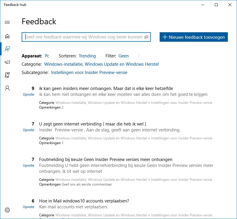 Als Windows Insider is het sowieso van belang dat je de Feedback-hub leert kennen. Hier breng je Microsoft namelijk op de hoogte van de problemen die je tegenkomt. Je kunt ook suggesties geven, bijvoorbeeld wanneer je bepaalde functies in Windows 10 nog mist. Open de feedback-hub vanuit het startmenu en klik op het figuurtje met het tekstballonnetje. Hier vind je een lijst met problemen die door andere gebruikers zijn aangegeven. Kom je hier een probleem tegen waar je zelf ook tegenaan loopt, klik dan op upvote. Mede dankzij het aantal ‘upvotes’ kan Microsoft zien hoeveel mensen last hebben van dezelfde bug. Het bedrijf kan er dan voor kiezen om dit probleem voorrang te geven in een volgende build. Om zelf een opmerking aan een reeds gemeld probleem toe te voegen, klik je op het onderwerp en kies je voor Opmerking schrijven. Zodra je bericht klaar is, druk je op Verzenden.