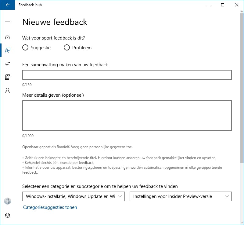 Als je zelf tegen een bug aanloopt waarvan nog geen melding is gemaakt, dan kun je dat ook melden in de Feedback-hub. Voordat je dit doet, is het slim om eerst te achterhalen of andere gebruikers er niet al over geschreven hebben. Dat doe je door trefwoorden in te voeren in de zoekbalk, bovenaan in het Feedback-menu. Zit jouw probleem er nog niet tussen, klik dan op Nieuwe feedback toevoegen. Kies in het volgende scherm eerst of het een suggestie of een probleem betreft. Daaronder vul je een korte samenvatting van je boodschap in. Dit wordt later de titel van je feedback. Daaronder is nog een tekstveld, waar je het probleem extra uit de doeken kunt doen. Kies onderaan nog een categorie (bijvoorbeeld Microsoft Edge) en een subcategorie (zoals Tabbladen en vensters). Druk vervolgens op Verzenden. Het zou overigens zomaar kunnen dat Microsoft persoonlijk antwoord geeft. Dat zie je aan de melding “Er is een officieel antwoord gepost”. Dat bericht staat altijd boven alle andere meldingen.