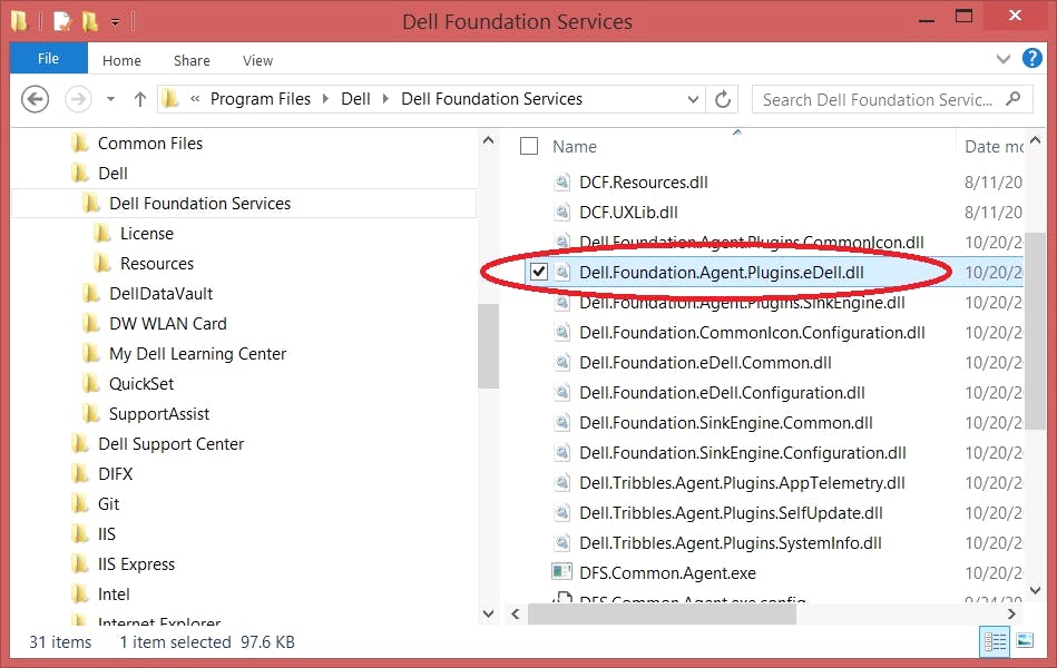 Ga nu naar je Verkenner, en navigeer naar deze map (of kopieer het in je taakbalk): C:\Program Files\Dell\Dell Foundation Services. Zoek daar de plugin Dell.Foundation.Agent.Plugins.eDell.dll en verwijder die (en leeg daarna je Prullenbak gelijk even). Klik op 'Doorgaan' als je computer daarom vraagt.
