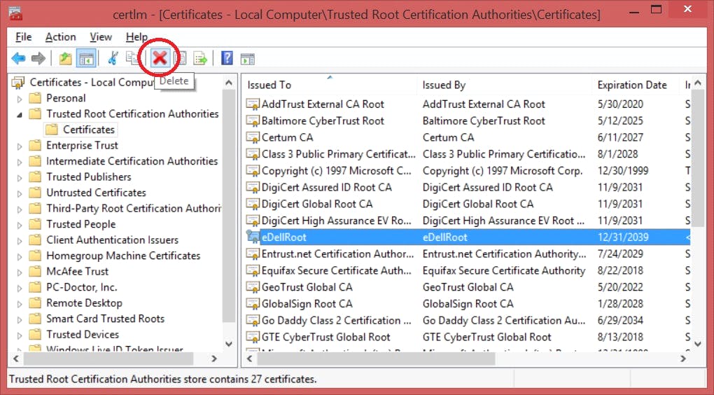 Let hier goed op dat je specifiek alleen eDellRoot hebt aangeklikt - je wil immers geen belangrijke certificaten verwijderen!