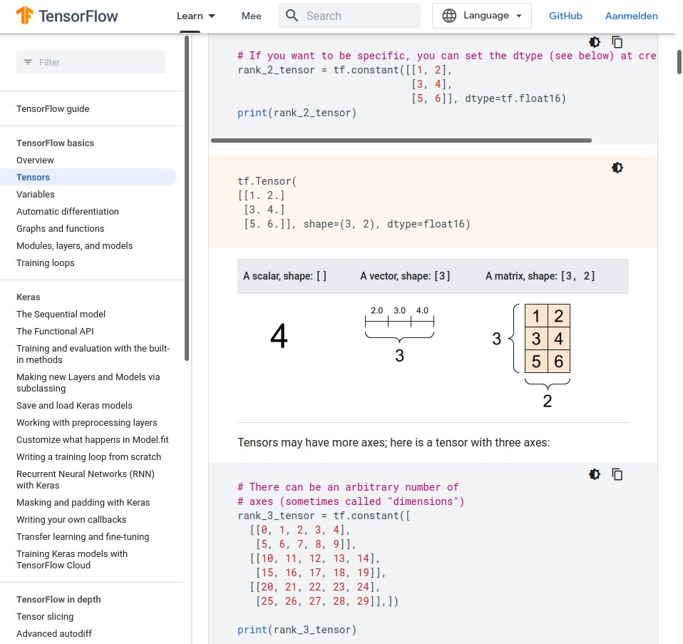 Voor elke taak waarvoor je een neuraal netwerk wilt trainen, moet je dus de data omzetten in tensors. Een afbeelding waarin je objecten wilt herkennen, zet je dan om in een tensor van rang 3: de vorm is dan [hoogte, breedte, kanalen], waarbij kanalen voor de kleurkanalen zoals rood, groen en blauw staat.