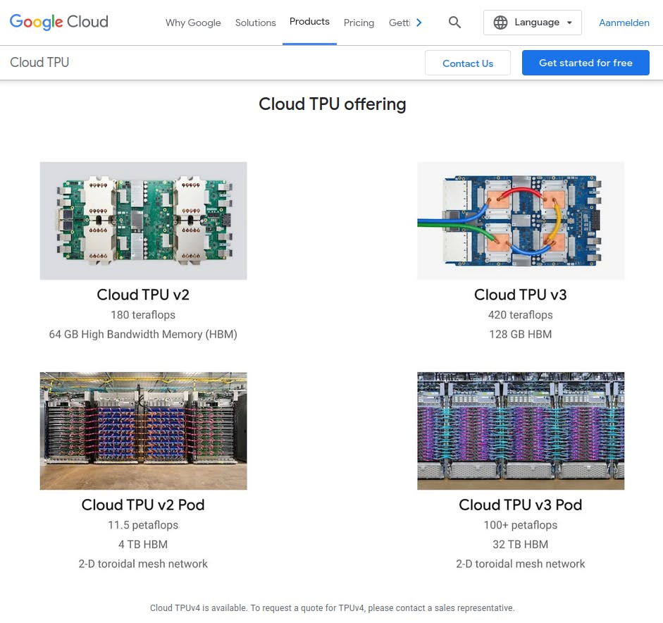 Sinds 2018 biedt Google zijn TPU’s ook aan als onderdeel van het Google Cloud Platform. De dienst heet Cloud TPU. Zo heeft de tweede generatie van de Cloud TPU een snelheid van 45 teraflops. Daarvan worden vier chips op één module geplaatst, met een totale snelheid van 180 teraflops. Google assembleert 64 van die modules tot een ‘pod’ van 256 Cloud TPU-chips met een totale snelheid van 11,5 petaflops.