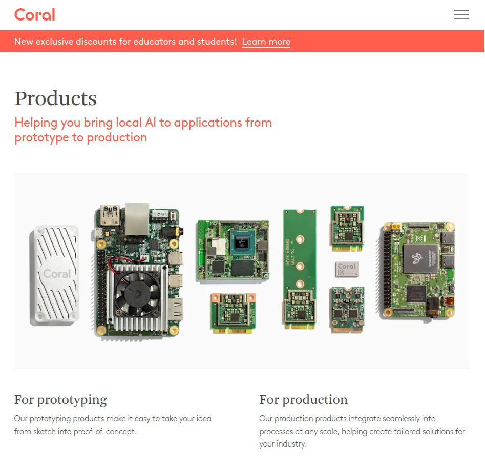 Google biedt zijn Edge TPU-producten aan onder de merknaam Coral. Tot de beschikbare producten behoren ontwikkelbordjes van allerlei afmetingen, M.2-insteekkaartjes en de USB Accelerator die je eenvoudig via usb op je laptop of Raspberry Pi aansluit. De Edge TPU wordt ook aan andere fabrikanten gelicentieerd. Zo biedt Asus zijn ontwikkelbordje Tinker Edge T aan, evenals een PCIe-kaart waarin 8 of 16 Edge TPU-chips zijn geïntegreerd.