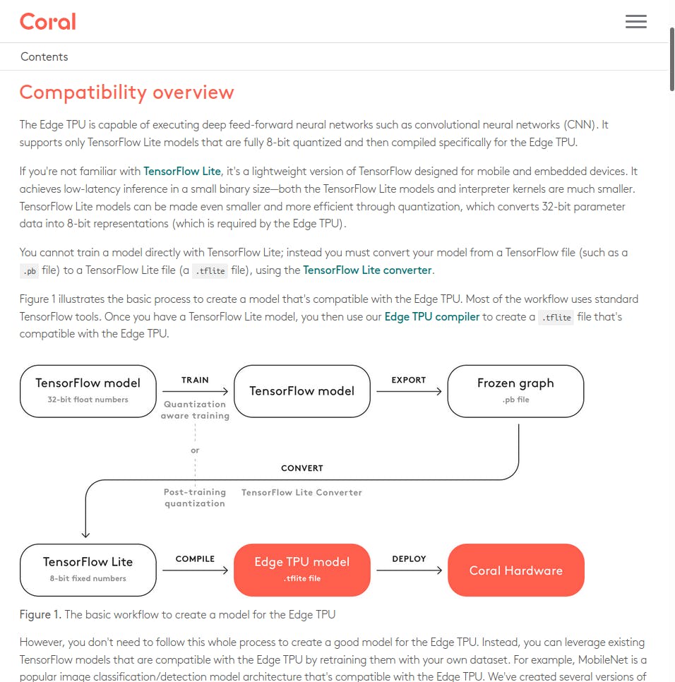Bij de Edge TPU ziet het plaatje er al heel wat inzichtelijker uit. Google heeft uitgebreide documentatie over de compatibiliteit van TensorFlow-modellen op de Edge TPU. Allereerst is er de beperking dat de Edge TPU alleen feed-forward neurale netwerken kan uitvoeren. Hierbij vormen de verbindingen tussen neuronen geen cyclus, maar vloeit de informatie maar in één richting. Dit in tegenstelling tot de recurrent neural networks, waarvoor CPU’s overigens nog altijd goed geschikt zijn. De tweede beperking is dat de Edge TPU alleen TensorFlow Lite-modellen met 8bit-voorstellingen van data kan uitvoeren.