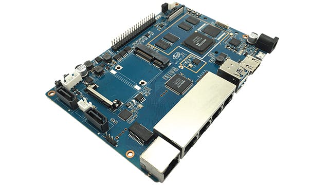 Sinovoip maakt met de Banana Pi-productlijn schaamteloos klonen van verschillende Raspberry Pi’s, maar deze BPI-R2 is een geval apart. Het is namelijk een opensource-router waar je zelf een besturingssysteem op kunt installeren, zoals Android, Bananian of OpenWrt. Het bordje bevat daarom een wan-poort en vier poorten voor gigabit-ethernet. Verder zien we onder meer een mini-pci-express-aansluiting, een wifi-module (zender en ontvanger) en twee usb3.0-poorten.