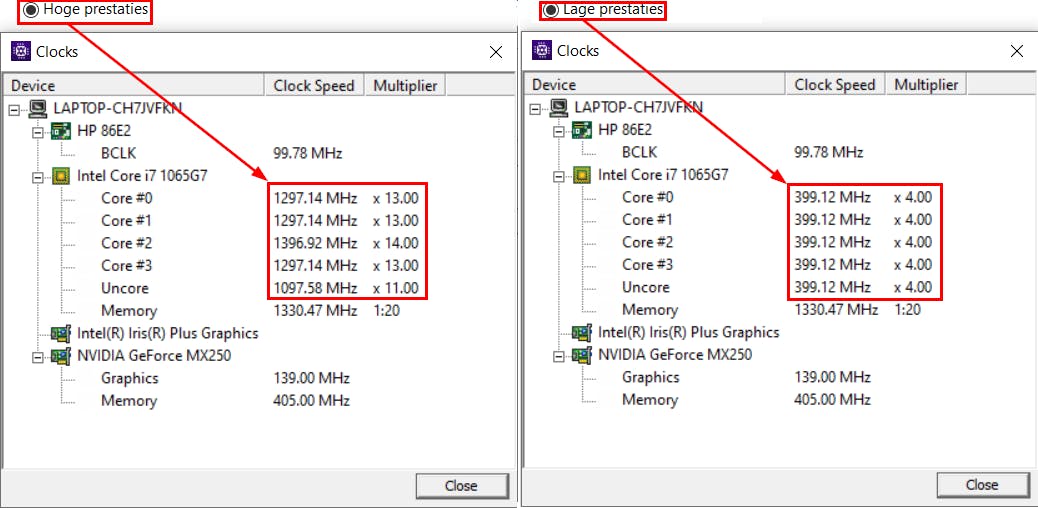Voor je cpu kun je het populaire CPU-Z inzetten. Hier lees je op het tabblad CPU detailinformatie af met onder meer de realtime waarden van de kloksnelheid (Core Speed) en het voltage (Core VID). Via Tools / Clocks kun je ook de kloksnelheid van de afzonderlijke cpu-kernen aflezen. Die kan wel variëren, afhankelijk van mogelijke energiebesparingsmodi. Wissel in Windows Energiebeheer bijvoorbeeld maar eens tussen de schema’s Energiebesparing en Hoge prestaties: je merkt meteen het verschil.