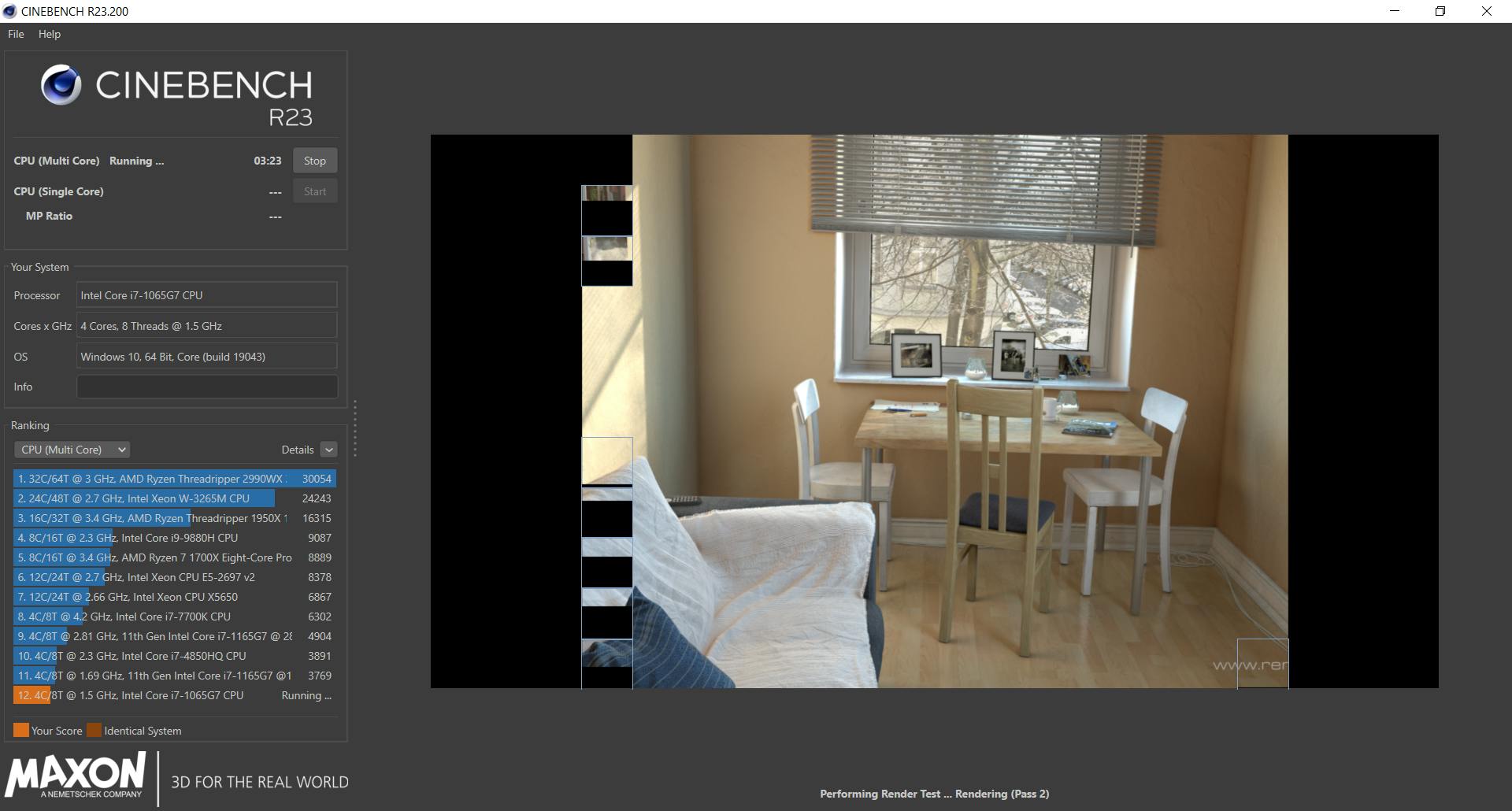 Een andere benchmarker is Cinebench. Deze tool, te vinden in de Microsoft Store, rendert tijdens de test een complexe afbeelding en is iets meer op high-endsystemen gericht. Via Preferences stel je zelf in hoeveel simultane threads je wilt aanspreken. Na afloop volgt een rangschikking met andere cpu’s.