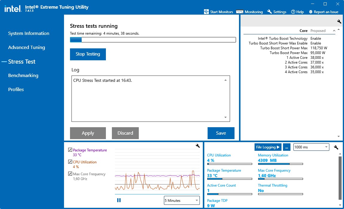 Het valt niet uit te sluiten dat je hierbij ook de Vcore wat moet verhogen voor meer stabiliteit, maar ook dat doe je dan in stapjes van maximaal +0,05 V. Tijdens het hele proces draai je het best ook een tool als CPU-Z – hoewel ook de Intel-tool een stresstest aan boord heeft – en voer je hiermee regelmatig korte stresstests uit. Haal er tevens de tool Core Temp bij om de cpu-temperatuur in de gaten te houden.