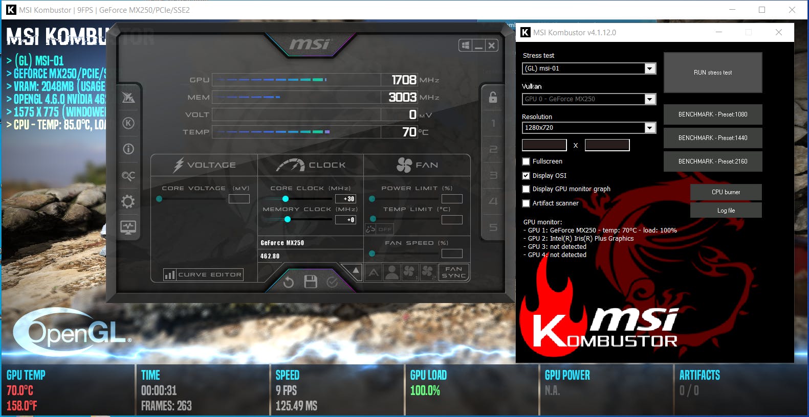 Tijdens de verhogingen laat je continu de stresstest van Kombustor draaien, waar je de resultaten in de gaten houdt, zoals de temperatuur van gpu en cpu. Worden de temperaturen te hoog of crasht de stresstest, zet dan de verhoging zo’n 10% lager dan je huidige testwaarde.