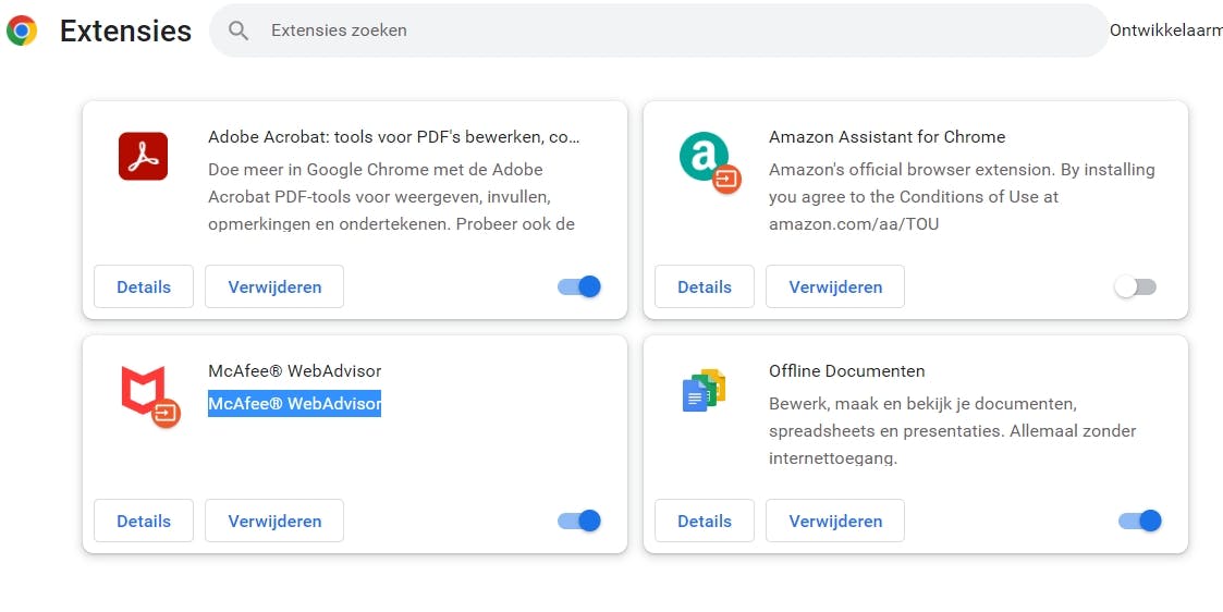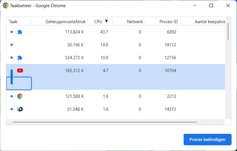 Extensies geven de browser meer mogelijkheden, maar genoeg is genoeg. Een overdaad aan extensies resulteert vaak in een verhoogd cpu-gebruik. Het kan ook zijn dat een bepaalde extensie zelf de boosdoener is. Bekijk dus de geïnstalleerde extensies en verwijder degene die je zelden of nooit gebruikt. Klik op het menupictogram in de rechterbovenhoek – dat zijn de drie puntjes – en ga naar Meer hulpprogramma’s. Hier kun je de opdracht Extensies openen. Gebruik de schakelaars om de ongebruikte extensies uit te schakelen of klik op de knop Verwijderen om ze definitief weg te halen. Daarna start je Chrome opnieuw op en houd je het cpu-gebruik in de gaten met behulp van Windows Taakbeheer.