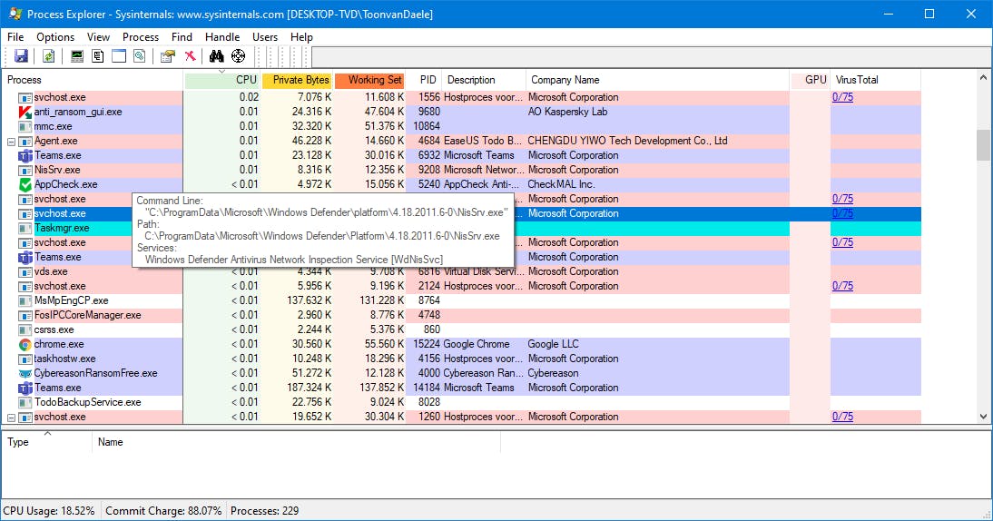 We vermelden nog het gratis programma Process Explorer, waar je net zo goed het cpu- en gpu-gebruik kunt aflezen. Handig is dat je de muispijl maar boven een proces hoeft te houden om de bijbehorende service(s) en opdrachtregelpad(en) af te lezen. En om het cpu-gebruik van een geopende applicatie te kennen, sleep je het vizier-icoon naar dat programmavenster.