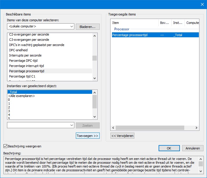 Klik nogmaals op Volgende en op Toevoegen. Open het onderdeel Processor, selecteer Percentage processortijd en plaats een vinkje bij Beschrijving weergeven. Bij Instanties van geselecteerd object kun je _Total geselecteerd laten of je voegt specifieke processorkernen toe. Rechts verschijnt nu Percentage processortijd - _Total. Bevestig met OK en stel Interval van steekproeven in op bijvoorbeeld 5 seconden. Druk op Volgende (2x) en op Voltooien.