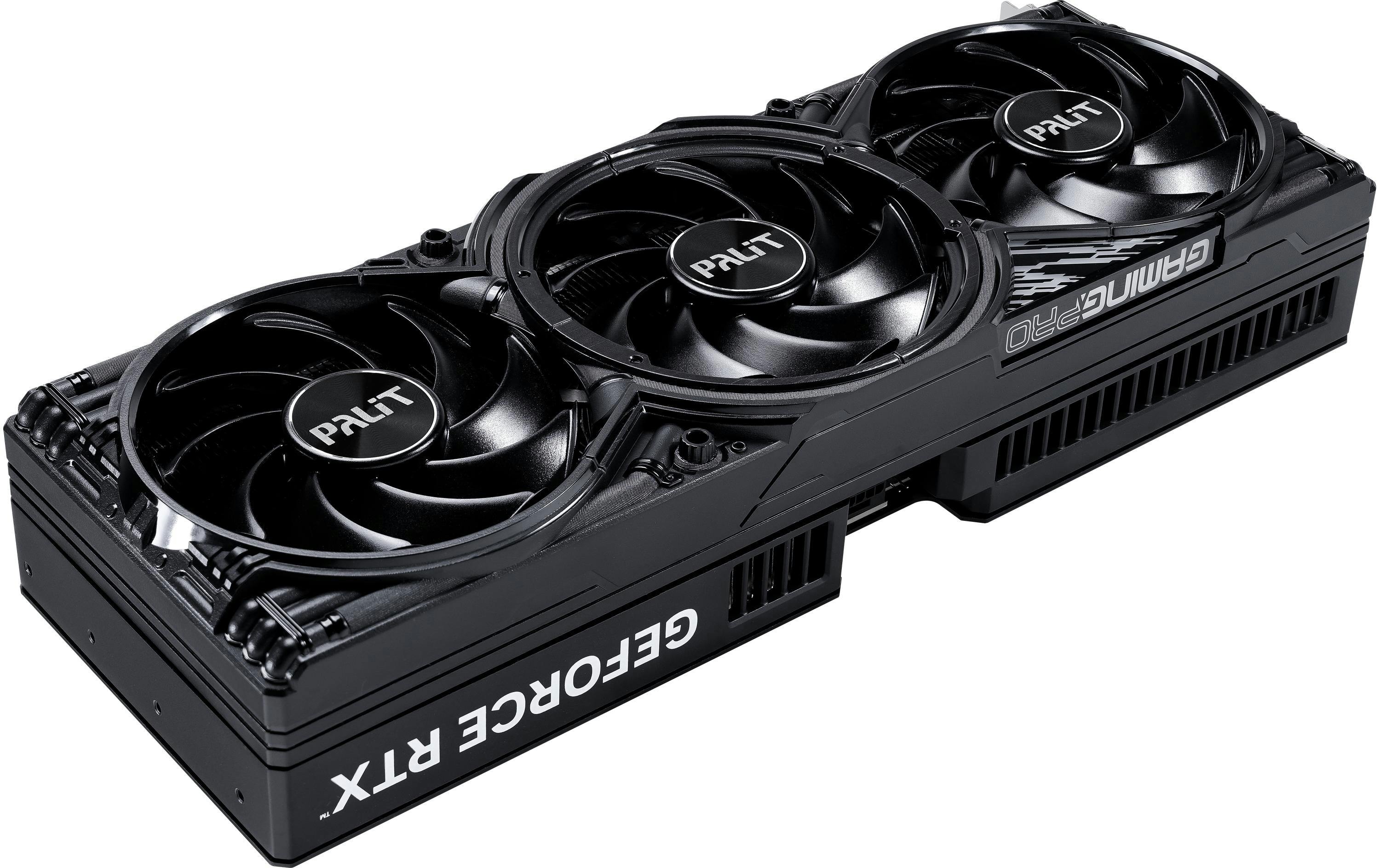 Ten opzichte van de Founders Edition heeft de GamingPro OC van Palit een iets grotere en traditionelere koeler met drie fans. De bouwkwaliteit is keurig, met een metalen frame en plastic ‘fan shroud’ (een ventilatorbehuizing die helpt de luchtstroom te richten voor een efficiëntere koeling). Verder heeft deze kaart zowel wat RGB-verlichting als een dubbele BIOS waarmee je kunt kiezen tussen een iets luidere en koelere modus of een iets stillere en marginaal minder koele modus.