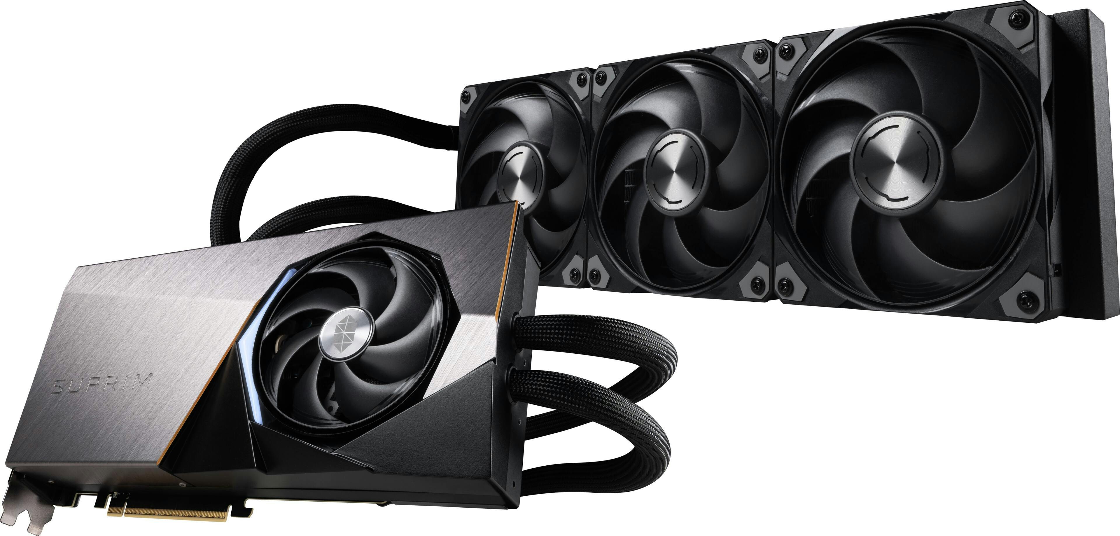 De Suprim Liquid SOC-variant van MSI is een iets ander beestje dan de overige kaarten: wat compacter met een externe 360mm-radiator en voorzien van waterkoeling. Dat heeft wat voordelen: zo zien we in de testresultaten dat deze kaart zowel de allerstilste als de allerkoelste kan zijn. Een grote radiator voert warmte nu eenmaal beter af. Dat heeft ook voordelen in een behuizing, waarbij je de warmte die gepaard gaat met 500 watt (of meer) energieverbruik direct de kast uitpompt in plaats van die warmte rond te circuleren. Zo zien we dat de cpu-temperatuur in een vergelijkbare opstelling met de Suprim Liquid eenvoudig tien graden (of meer!) lager zijn dan met een luchtgekoelde kaart. Watergekoelde gpu’s zijn niet altijd zinvol, maar met een verbruik van 500 watt of meer toont dit ontwerp absoluut zijn meerwaarde.