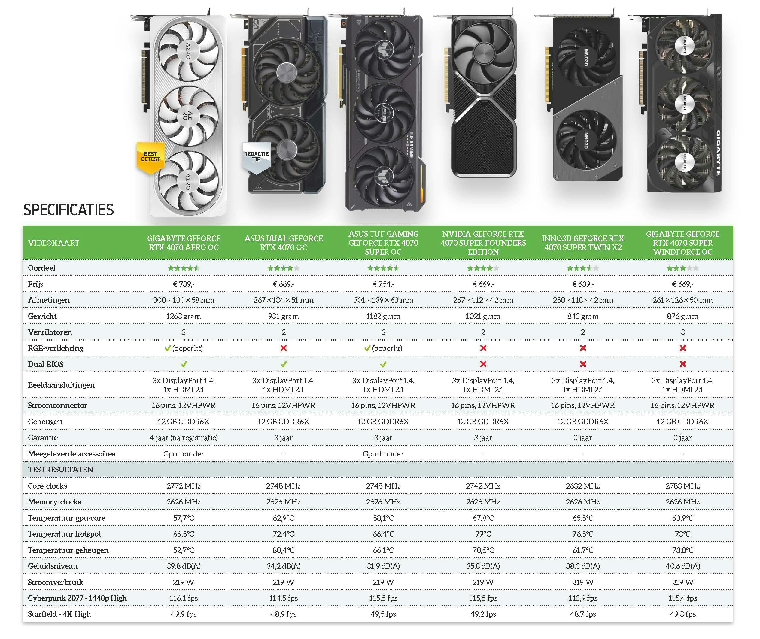 Het zijn echter de goedkopere kaarten waar we zelf ons geld aan uit zouden geven; de 4070 Super is immers al duur genoeg. Nvidia’s eigen Founders Edition is de meest begeerlijke kaart, maar is in de praktijk zelden te koop. Dit maakt het vooral een strijd tussen de ASUS Dual OC en de Inno3D Twin X2. De Inno3D is momenteel de goedkoopste én compactste, maar als je toch al 600 euro of meer uitgeeft aan je videokaart, vinden we een paar tientjes voor een duidelijk stillere kaart met een extra BIOS geen onredelijke extra uitgave. De redactietip gaat daarom naar de ASUS Dual OC, maar let vooral op de daadwerkelijke prijzen. Je maakt met geen van de geteste kaarten echt een foute keuze.