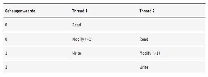 Op zich is het geen enkel probleem als er meerdere threads gebruik willen maken van hetzelfde geheugen, zolang er maar geen enkele thread is die naar het geheugen schrijft. Als er meerdere threads naar het geheugen schrijven, is dat zeker een probleem. Dit maakt multithreading onmiddellijk een stuk moeilijker … en gevaarlijker! Om een heel simpel voorbeeld te geven: stel dat er een programma is met een functie die enkel een teller verhoogt. Het volgende is een voorbeeld in C++: