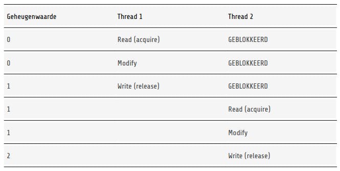 We willen dit programma graag multithreaded maken. Simpeler dan dit kan niet, dus je zou verwachten dat dit geen problemen zou kunnen geven. Helaas niet. Er gaat veel meer gepaard met het verhogen van een teller dan je zou verwachten. Dit heet een RMW- operatie: read-modify-write. Het systeem moet eerst uitlezen wat de teller is (bijvoorbeeld door het te kopiëren naar een processorregister), vervolgens dit aantal verhogen met 1 en dit daarna terugschrijven naar de geheugenlocatie. Vooral deze laatste stap gaat gepaard met een aanzienlijke vertraging. Wat als de teller op 2 staat en de functie wordt twee keer tegelijkertijd aangeroepen? In beide gevallen zal de functie 2 lezen en zal de verhoging daarom uitkomen op 3, terwijl het eigenlijk 4 zou moeten zijn.