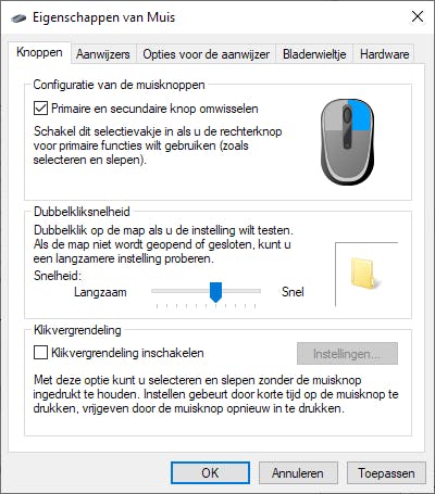 Ook verwarrend: verwissel de linker- en de rechtermuisknop. Open in het Configuratiescherm de instellingen voor Muis. In het eerste tabblad van de Eigenschappen van Muis zet je een vinkje bij de optie Primaire en secundaire knop omwisselen. Hierdoor kan jouw collega alleen selecteren en slepen met de rechtermuisknop, het contextmenu roept hij dan op met de linkermuisknop. Deze omzetting wordt actief als je op Toepassen klikt. Let op, want om dit venster te sluiten moet je de rechtermuisknop gebruiken. Tja, het went slecht.