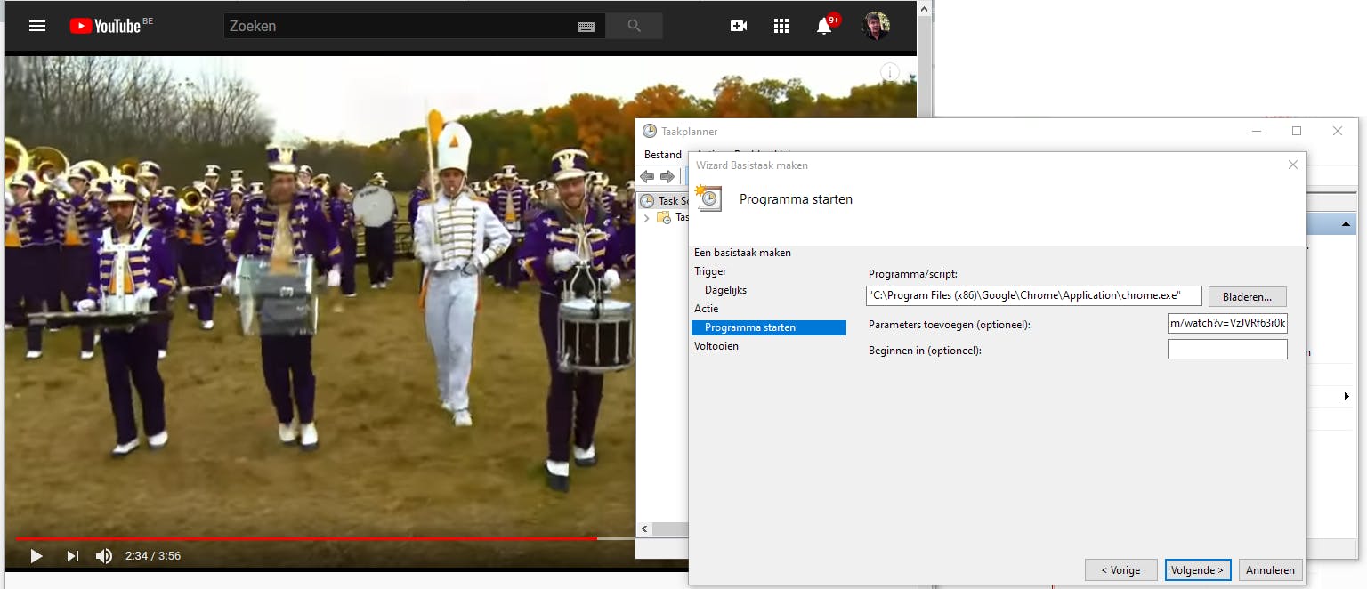 Met Taakplanner kun je bijzondere grappen maken die zelfs voor een ervaren computergebruiker moeilijk te achterhalen zijn. In dit voorbeeld tonen we hoe je iemands computer instelt om iedere dag om halfvijf een filmpje van een fanfare te tonen. Typ in het zoekvenster van Start het woord ‘Taakplanner’ om de app te openen. Vervolgens gebruik je het menu Actie, Basistaak maken. In de volgende stap geef je die taak een naam bijvoorbeeld ‘Fanfare’. Nadat je op de knop Volgende hebt geklikt vraagt Taakplanner of de taak Dagelijks, Wekelijks, Maandelijks of Eenmalig moet gebeuren. Wij gaan voor Dagelijks. Je moet ook nog het tijdstip van de trigger vastleggen, bijvoorbeeld 16u30. Een stap verder kom je bij de Actie en daar kies je Een programma starten. Via de knop Bladeren selecteert je het exe-bestand dat moet starten. In ons geval navigeren we naar C:\Program Files (x86)\Google\Chrome\Application\chrome.exe om de webbrowser Chrome te starten, en in het vak Parameters toevoegen plakken we het internetadres van het fanfarefilmpje. Klik op Voltooien, sluit de Taakplanner en wacht vol spanning op het einde van de werkdag.