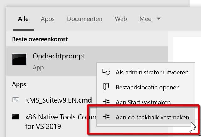 Klik op de Start-knop van Windows en tik CMD. Als de treffer Opdrachtprompt tevoorschijn komt, klik je daarop met de rechtermuisknop om te kiezen voor de contextmenu-optie Aan de taakbalk vastmaken. Met als gevolg dat de Opdrachtprompt (= het DOS-venster) op de taakbalk komt te staan.