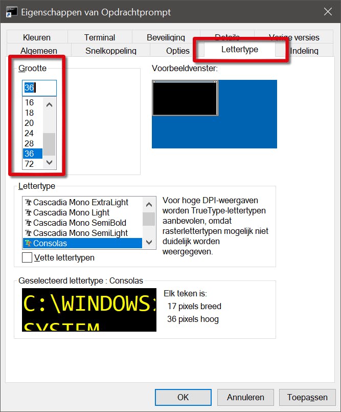 Standaard ingesteld is het niet prettig werken met het DOS-venster. Klik twee keer met de rechtermuisknop op het pictogram van de Opdrachtprompt, dat reeds op de taakbalk staat. Kies voor de contextmenu-optie Eigenschappen. Ga aan het werk op de tabbladen Kleuren en Lettertype. Kies voor mooi contrasterende kleuren en stel tevens een grotere letter in. Het voorbeeldvenster laat zien hoe dat uitpakt.