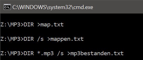 In een map met mp3-bestanden zou je ook dit commando kunnen proberen: DIR *.mp3 /s >mp3bestanden.txt. Gebruik daarna Kladblok om de aangemaakte txt-bestanden te openen.