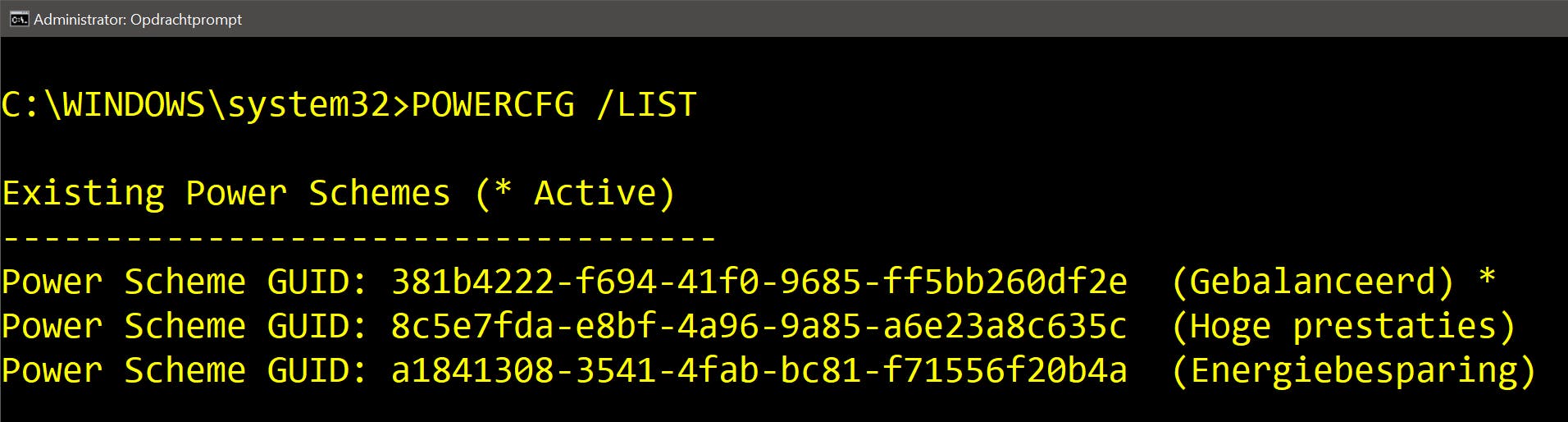 Open het DOS-venster als administrator en geef het commando POWERCFG /LIST. Je krijgt dan alle energiebeheerschema’s te zien en je ziet ook welk energiebeheerschema actief is. Het commando POWERCFG /ENERGY kan je vertellen of er problemen zijn met het energiebeheer van je computer.