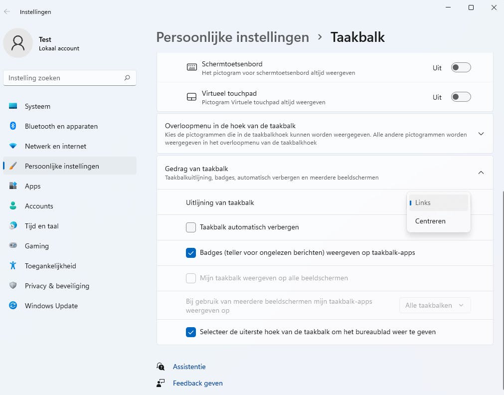 Een van de veranderingen in Windows 11 die direct in het oog springt is het feit dat de pictogrammen op de taakbalk nu in het midden gecentreerd staan, evenals de startknop. In alle andere Windows-versies vond je dit onderdeel natuurlijk helemaal linksonder. De positie van de pictogrammen en de startknop kun je weer op die bekende plek zetten. Klik met de rechtermuisknop op de taakbalk en kies voor Taakbalkinstellingen. Ga vervolgens naar Gedrag van de taakbalk en klik erop. Daarna verander je de optie Uitlijning van taakbalk van Midden naar Links.