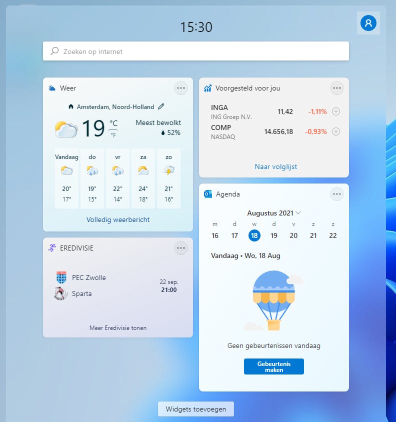 De functie Widgets laat in één oogopslag het weerbericht, nieuwsberichten, sportuitslagen of afspraken zien. Standaard wordt er in het widgetoverzicht echter geen agenda weergegeven. Om die toe te voegen, klik je op de Widget-knop op de taakbalk of gebruik je de toetscombinatie Windows-toets+W. De Widget-functie kun je trouwens alleen maar gebruiken met een Microsoft-account. Ben je aangemeld, klik dan onderaan op Widgets toevoegen. Vanzelfsprekend klik je nu op Agenda. Je ziet vervolgens in de widget alle data te zien en de eventuele afspraken die staan ingepland.